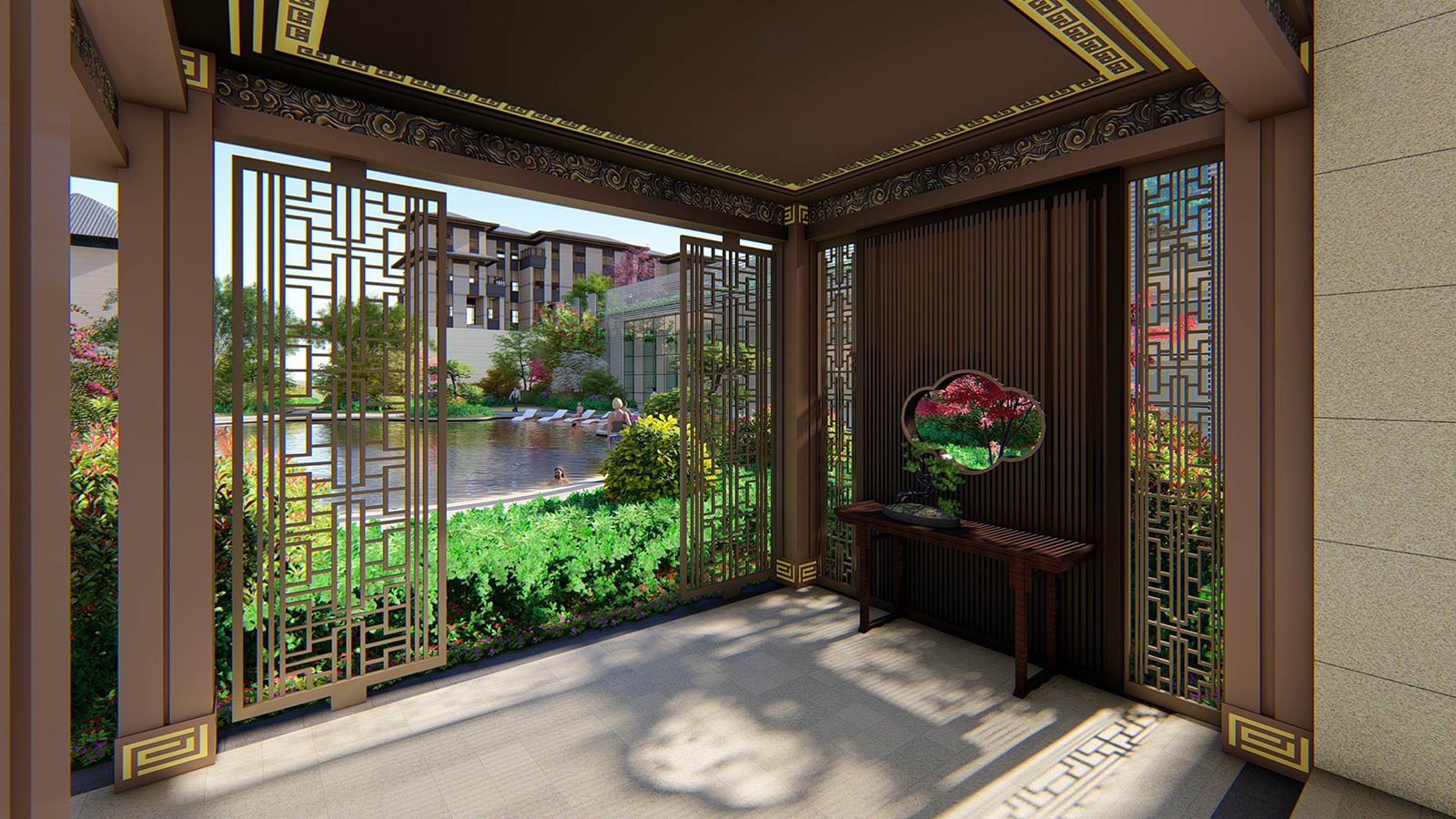 以山水雍華,東方大境為設計主題鏡面水景與絹畫景墻屏風,汲取流經吉安贛江水脈與新干玉華山風景區山脈形制。