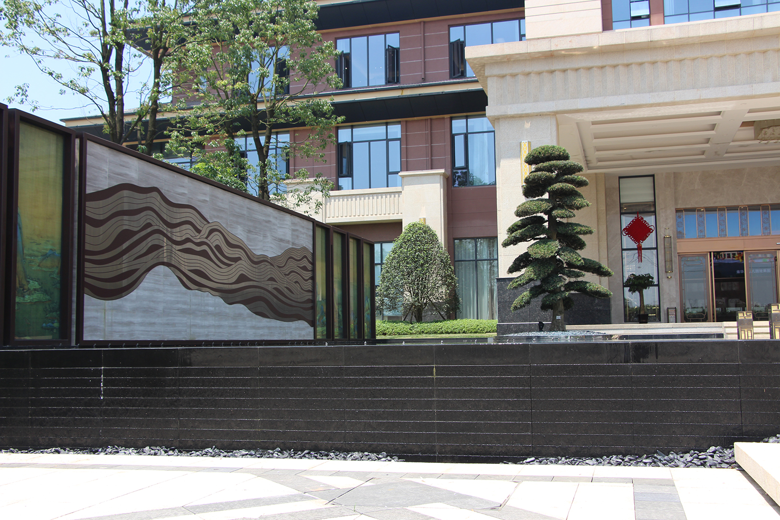 以真絲絹布打印青山綠水長軸,運用現代工藝,將絹畫夾在玻璃中間,中間景墻墻以高端法國木紋為背景,配合鋁板材質雕刻的山脈紋理,結合現代鏡面水景,利用朝夕的光影變化,仿佛古今交映,再現浩瀚江山壯美之境。